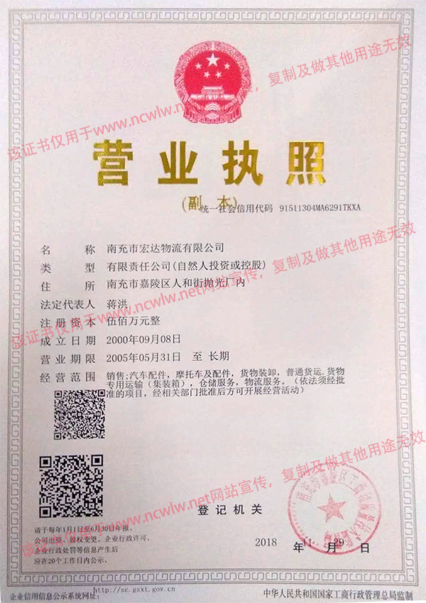 南充物流網(wǎng)(m.51mulayou.com) 南充市宏達物流有限公司營業(yè)執(zhí)照