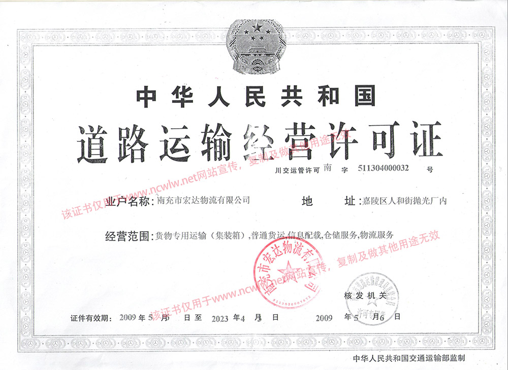 南充物流網(wǎng)(m.51mulayou.com) 南充市宏達物流有限公司道路運輸經營許可證